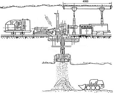 反井鉆機工藝原理是通過鉆機的電機帶動液壓馬達,液壓馬達驅(qū)動水龍頭,并利用液壓動力將扭矩傳遞給鉆具系統(tǒng),帶動鉆桿及鉆頭旋轉(zhuǎn),導孔鉆頭或擴孔鉆頭上的滾刀在鉆壓的作用下,沿井底巖石工作面做純滾動或微量滑移。同時主機油缸產(chǎn)生的軸向拉、壓力,也通過動力頭、鉆桿作用在導孔鉆頭或擴孔鉆頭上,使導孔鉆頭的滾刀在鉆壓作用下滾動,產(chǎn)生沖擊荷載,使?jié)L刀齒對巖石產(chǎn)生沖擊、擠壓和剪切作用,破碎巖石。被破碎的巖屑在導孔鉆進時被正循環(huán)的洗井液沖洗,巖屑沿著鉆桿與孔壁間的環(huán)形空間由洗井液提升到鉆孔外。在擴孔時將導孔鉆頭卸下,安裝反擴滾刀,巖屑靠自重直接落到下水平巷道內(nèi),采用裝載機和運輸設備及時清理運出。該機器施工工藝簡單,鉆井速度快,適應性強,能滿足不同巖層施工需求。